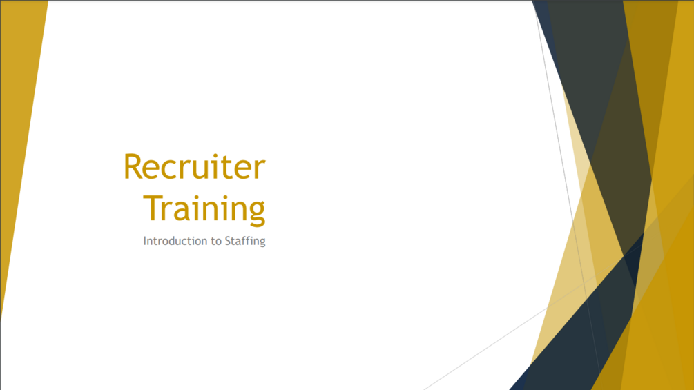 Basic Recruiter Training designed for new recruiters just starting out in the staffing industry. Focus of the content is agency recruiting, but corporate recruiters will also find value. The basic functions of a recruiter are broken down into sections, along with explanations on why something is important.